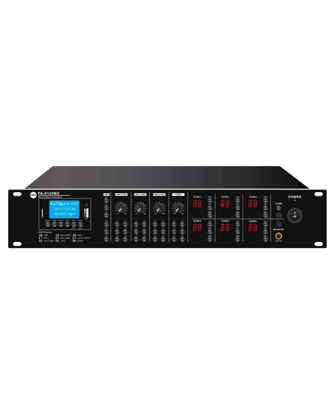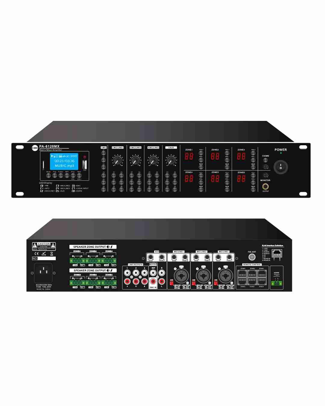 The CMX PA-6120MX 6 Zone Matrix Amplifier is a high-performance 6 zone mixer amplifier specially designed for professional public address and background music applications. With 6 independent audio zones and a powerful 6 x 120W RMS output, this amplifier is ideal for schools, offices, hospitals, hotels, shopping malls, religious places, factories, and commercial buildings across India. This advanced matrix PA amplifier allows you to play different audio sources in different zones at the same time, making it perfect for multi-room sound distribution. Whether you need music playback, microphone announcements, emergency paging, or zone-wise audio control, the PA-6120MX delivers reliable and crystal-clear performance. Equipped with Bluetooth, USB, SD card, FM radio, AUX input, emergency input, and mic/line support, this amplifier offers complete flexibility for modern audio installations. The built-in protection system ensures safe operation with overload, short-circuit, and over-temperature protection.